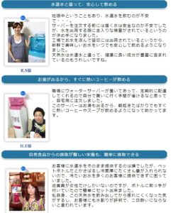 天然水をその都度買いに行くよりもボトルで届いて設置すればすぐ飲めるしいいよねと言う意見でした。